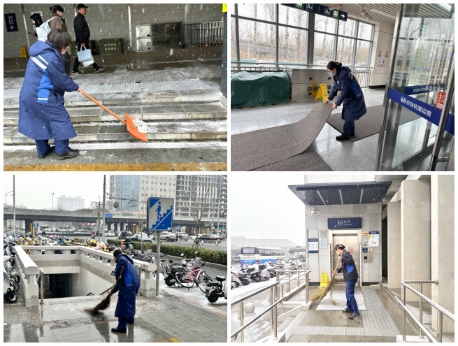 各车站加强重点部位巡视,针对车站站前广场、下沉广场、台阶地面、无障碍坡道、楼梯等客流密集区域,做好客流疏导及宣传提示,及时清理出入口及站外地面积雪积冰,放置防滑垫198块、警示牌160个,确保乘客安全、顺畅进出站。针对降雪天气夜间气温较低,12日晚,大兴机场线草桥站适当延缓闭站时间,为预约出租车接驳的乘客提供温暖的候车环境。燕房线车站工作人员主动清理站前与公交车站区域积雪,为公交接驳乘客提供便利的候车环境。必要时,车站将提前开门运营,进一步做好服务保障。